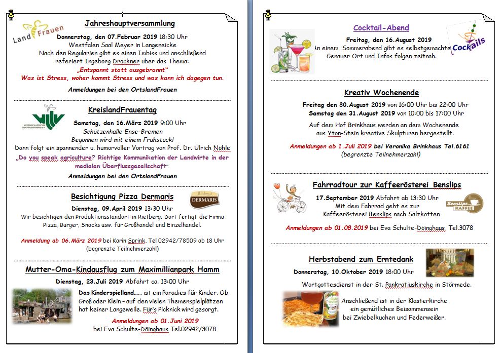 07.02.2019 18:30 Uhr Westfalen Saal Meyer in Langeneicke Jahreshauptversammlung Ortslandfrauen