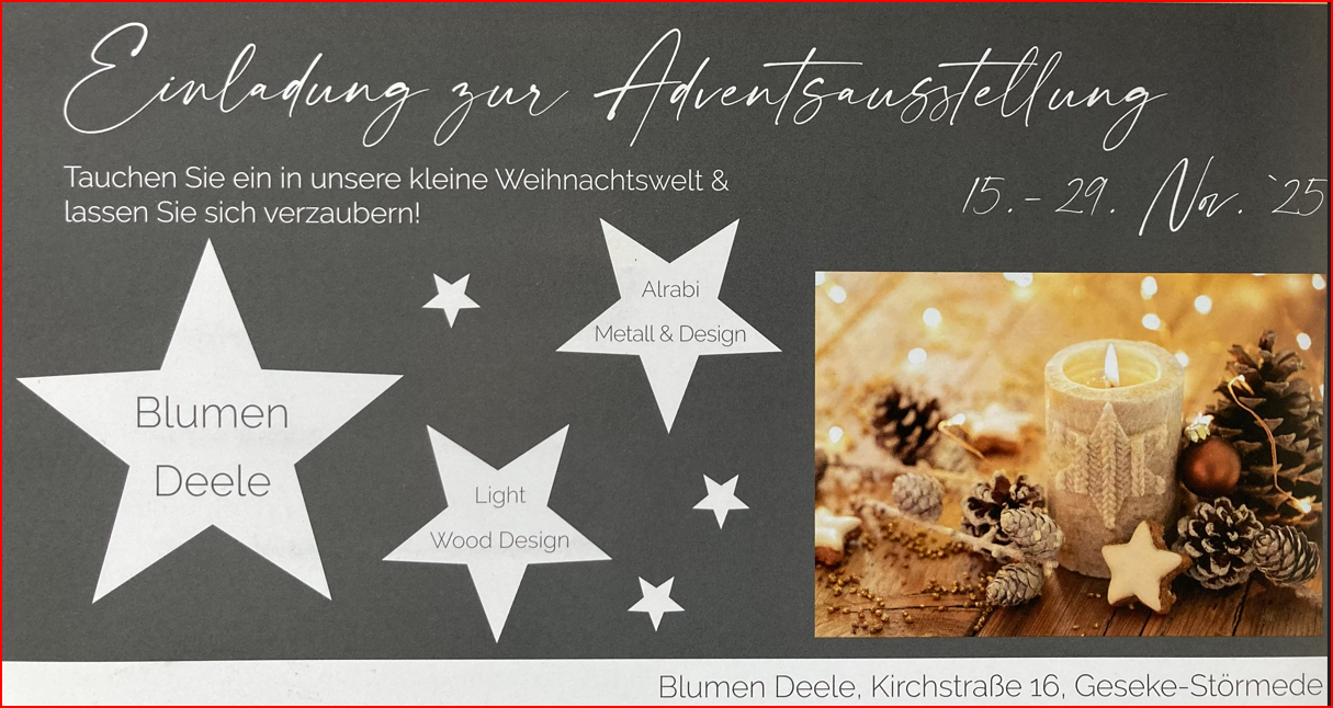 Vom 15. bis 26. November lädt die Blumen Deele herzlich zur Adventsausstellung in die Kirchstraße 16, in Geseke-Störmede ein.