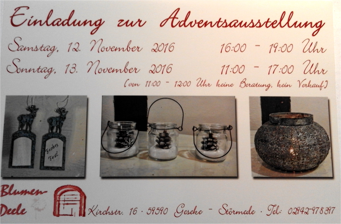 Am Samstag, den 12. November und Sonntag, den 13. November 2016 findet in der Blumendeele, Kirchstrasse 16, eine Adventsausstellung statt. Am Sonntag von 11-12 Uhr gibt es