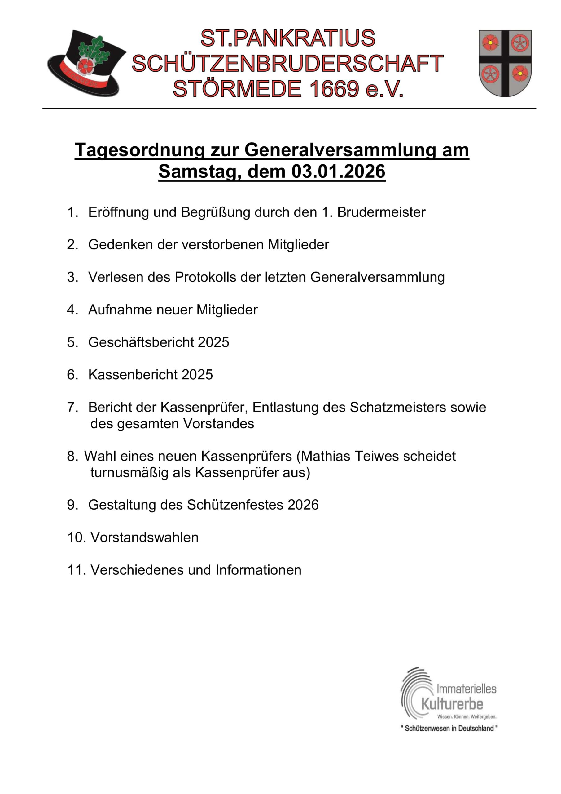 Die Schützenbruderschaft lädt am Samstag, den 03. Januar 2026 um 20:00 Uhr zur Generalversammlung im Haus Nazareth.