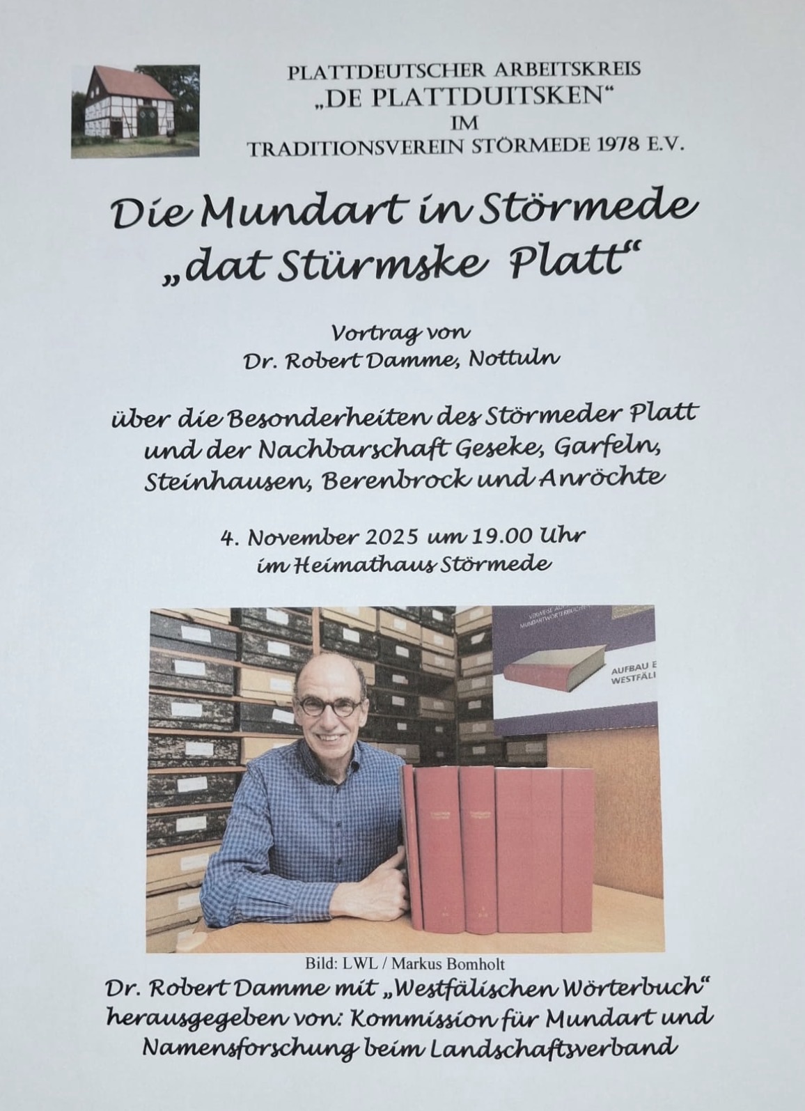 TVS – „dat Stürmske Platt“ in Traditionsverein Datum 4. November 2025 Uhrzeit 19:00 Heimathaus Steinweg 4b