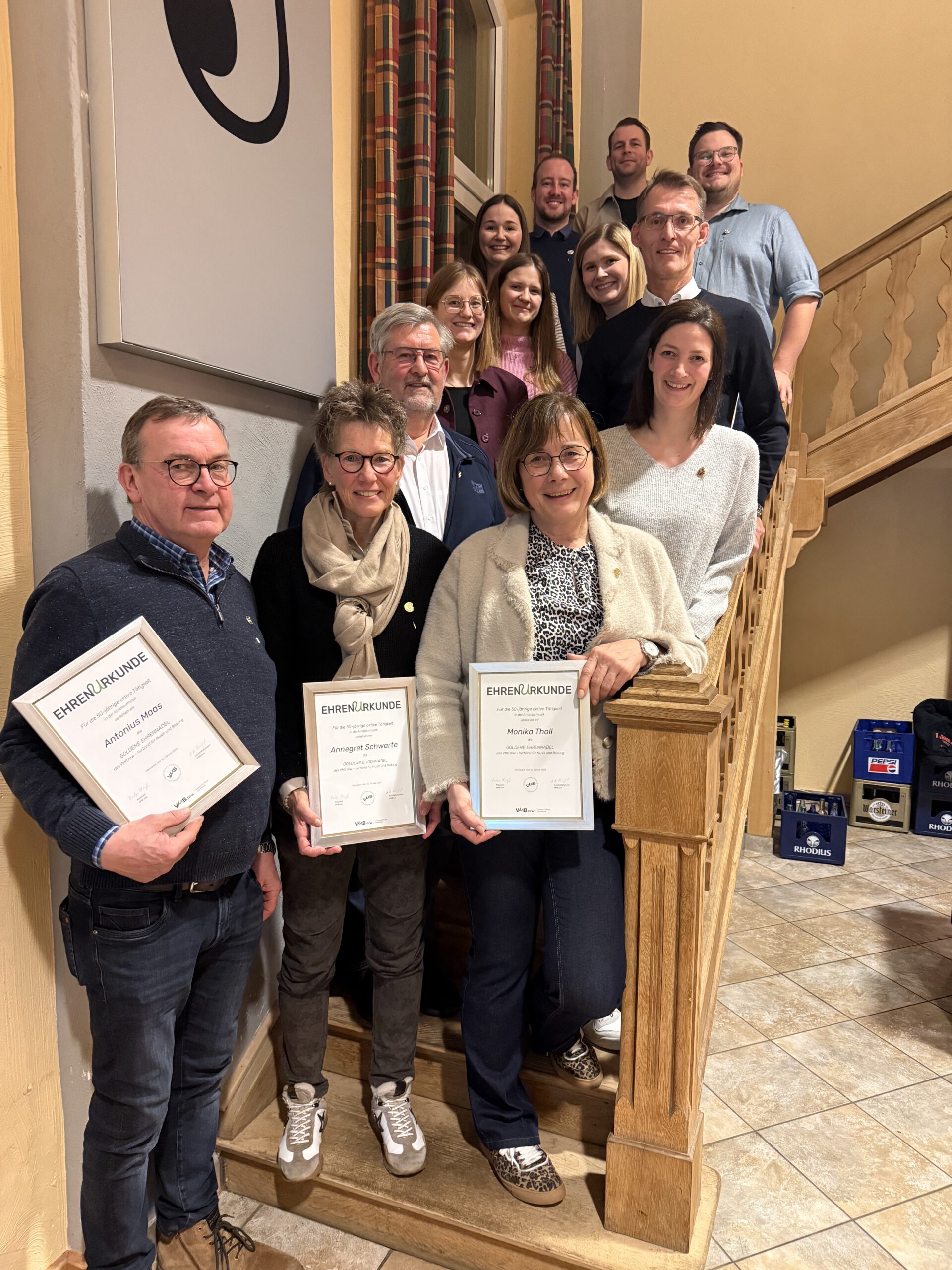 Auch in diesem Jahr wurden wieder zahlreiche treue Mitglieder des Musikzuges geehrt. Neben Auszeichnungen für 10, 20 und 25-jährige Mitgliedschaft wurden gleich 5 Mitglieder für ihre 50-jährige Treue ausgezeichnet. Annegret Schwarte, Monika Tholl, Michael Neubert, Arthur Fuhrmann und Antonius Maas erhielten vom 1. Vorsitzenden die neuen Orden des Verbands für Bildung und Musik.