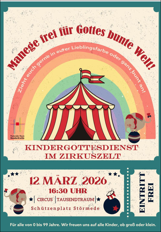 Der Pastoralverbund Geseke-Erwitte lädt herzlich zum Kindergottesdienst im Zirkuszelt ein. Unter dem Motto „Manege frei für Gottes bunte Welt!“ sind alle Kinder und Familien eingeladen.