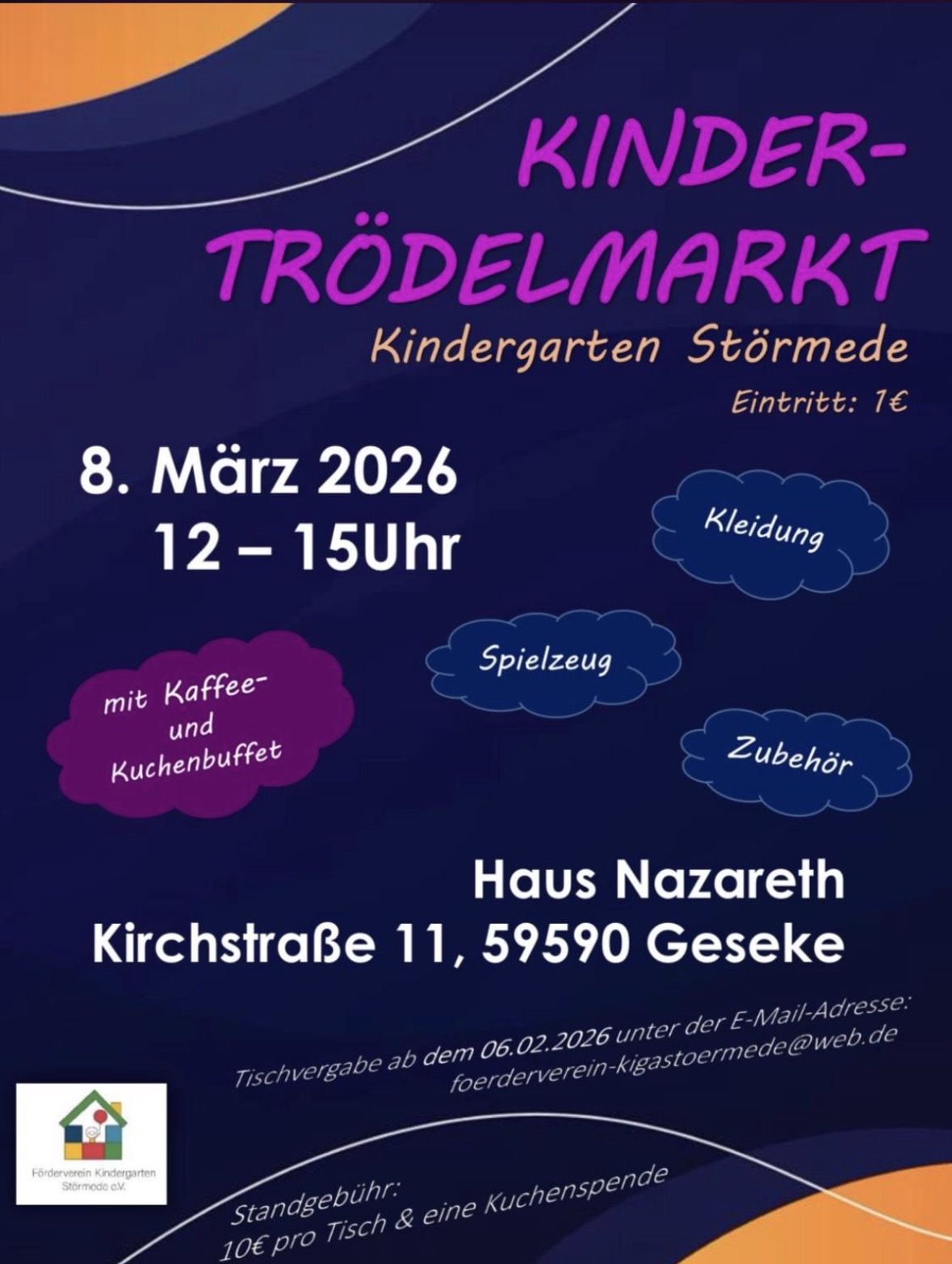 Am Sonntag, den 8. März 2026, findet von 12:00 bis 15:00 Uhr der Kindertrödelmarkt des Kindergartens Störmede im Haus Nazareth, Kirchstraße 11 in 59590 Geseke, statt.