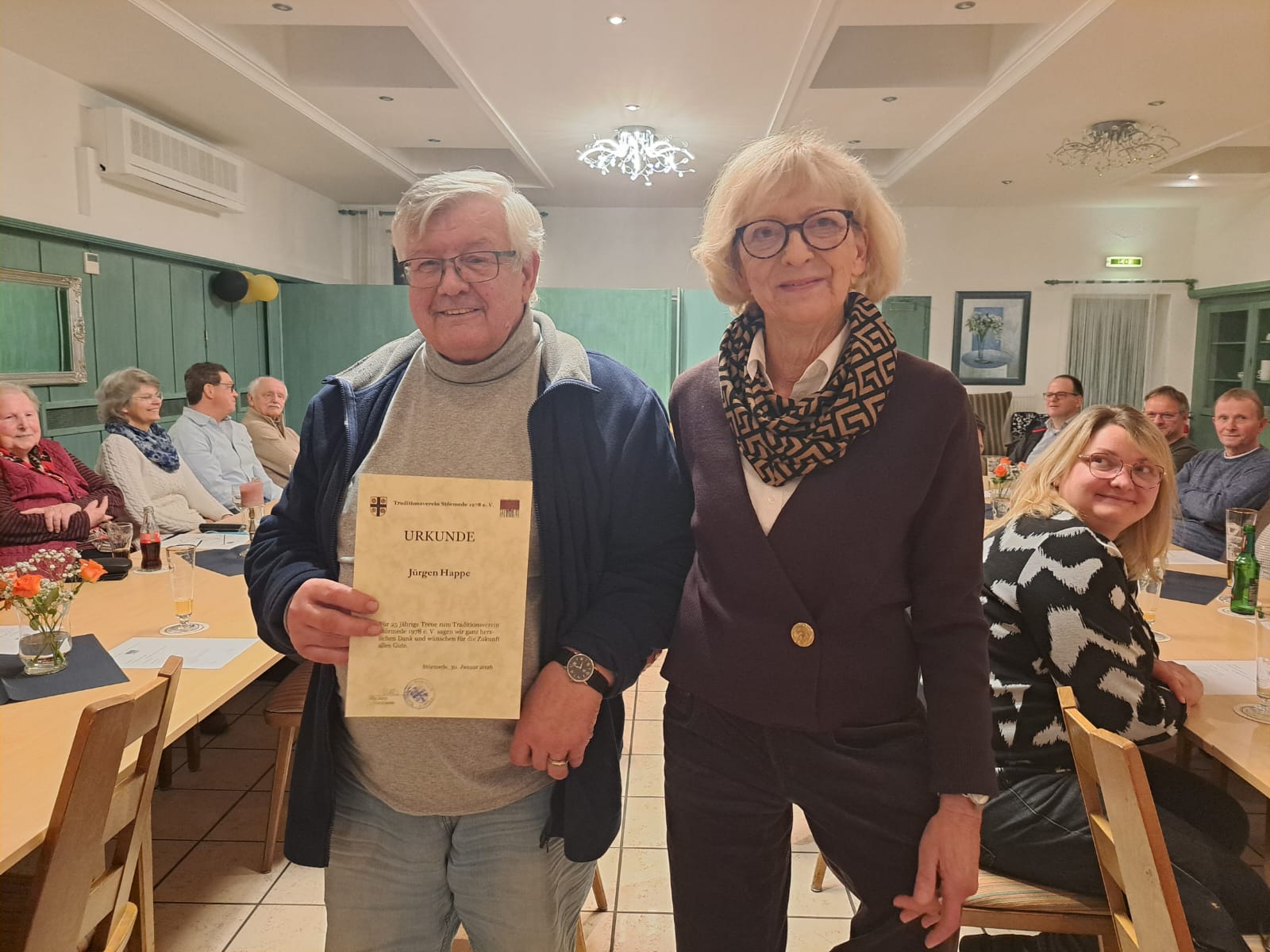 Die Vorsitzende Ulla Jütte gratulierte allen Jubilaren zur 25jährigen Mitgliedschaft im TVS. Jubilar Jürgen Happe war aktiv beim Bau des Heimathauses und hat damals mit Zylinder das Einmauern der verzinkten Dokumentenrolle in den Gedenkstein im Heimathaus übernommen. (s. Bild)