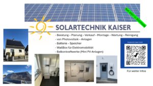 Solartechnik Kaiser Beratung - Planung - Verkauf - Montage u. Wartung von Photovoltaik- und Solarthermie-Anlagen 0172 234 89 04 info@Kaiser-Solar.de www.kaiser-solar.de